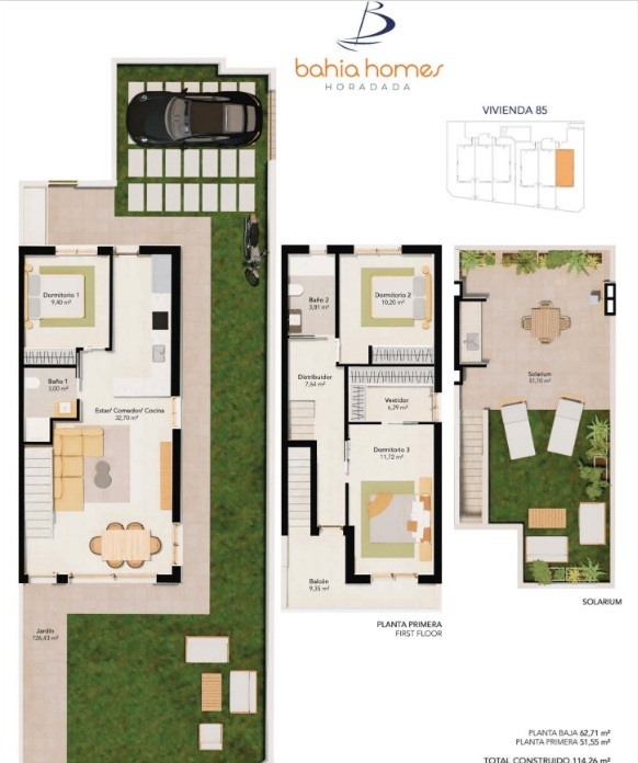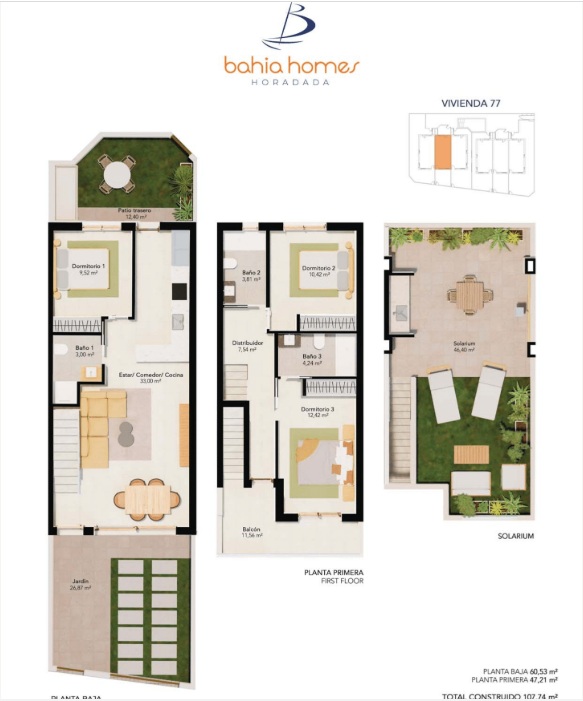 107,74 m2 de superficie contruida, 3 dormitorios, 3 baños, terraza con 39,01 m2, solarium con 46,40 m2, piscina comunitaria. Cocina amueblada con electrodomésticos, zona para cocina o BBQ exterior en solárium, suelo radiante en salón, cocina y baños, pre-instalación de aire acondicionado, pack de iluminación interior y exterior incluido, y plaza de Garaje incluida. Precio: 354.900 €, IVA no incluido.