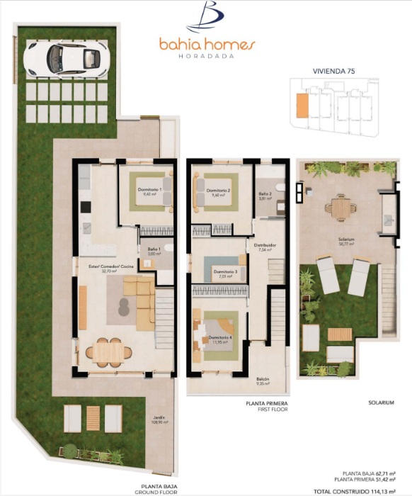 114,13 m2 de superficie contruida, 4 dormitorios, 2 baños, terraza con 64,43 m2, solarium con 50,77 m2, y piscina comunitaria. Cocina amueblada con electrodomésticos, zona para cocina o BBQ exterior en solárium, suelo radiante en salón, cocina y baños, pre-instalación de aire acondicionado, pack de iluminación interior y exterior incluido, y plaza de Garaje incluida. Precio: 369.900 €, IVA no incluido.