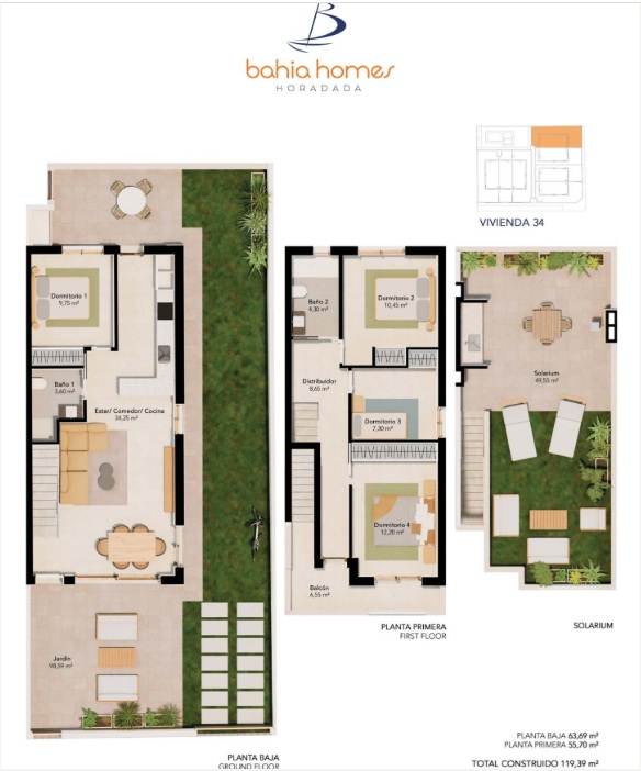 115,07 m2 de superficie contruida, 3 dormitorios, 3 baños, terraza con 41,95 m2, solarium con 47,58 m2, piscina comunitaria y jacuzzi calefactado. Cocina amueblada con electrodomésticos, zona para cocina o BBQ exterior en solárium, suelo radiante en salón, cocina y baños, pre-instalación de aire acondicionado, pack de iluminación interior y exterior incluido, y plaza de Garaje incluida. Precio: 344.900 €, IVA no incluido.