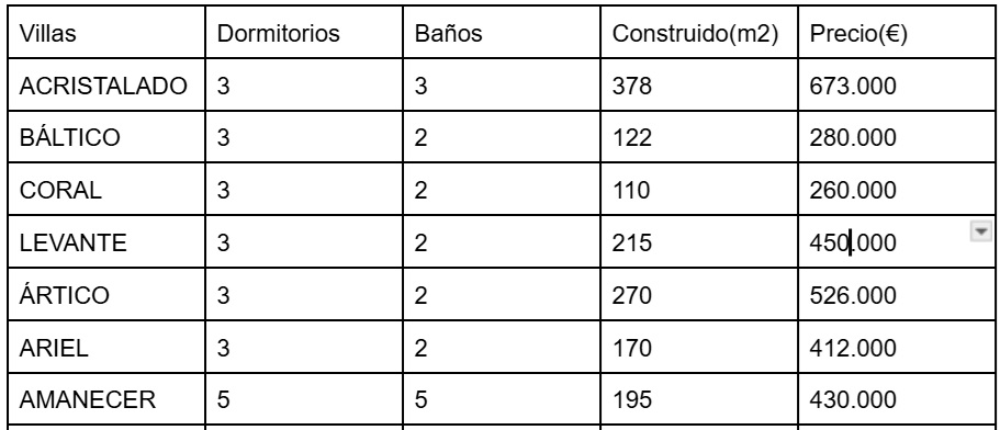 Precios de construcción de los distintos modelos de villas sin incluir el 10% de IVA. No se incluye el valor de la parcela.: