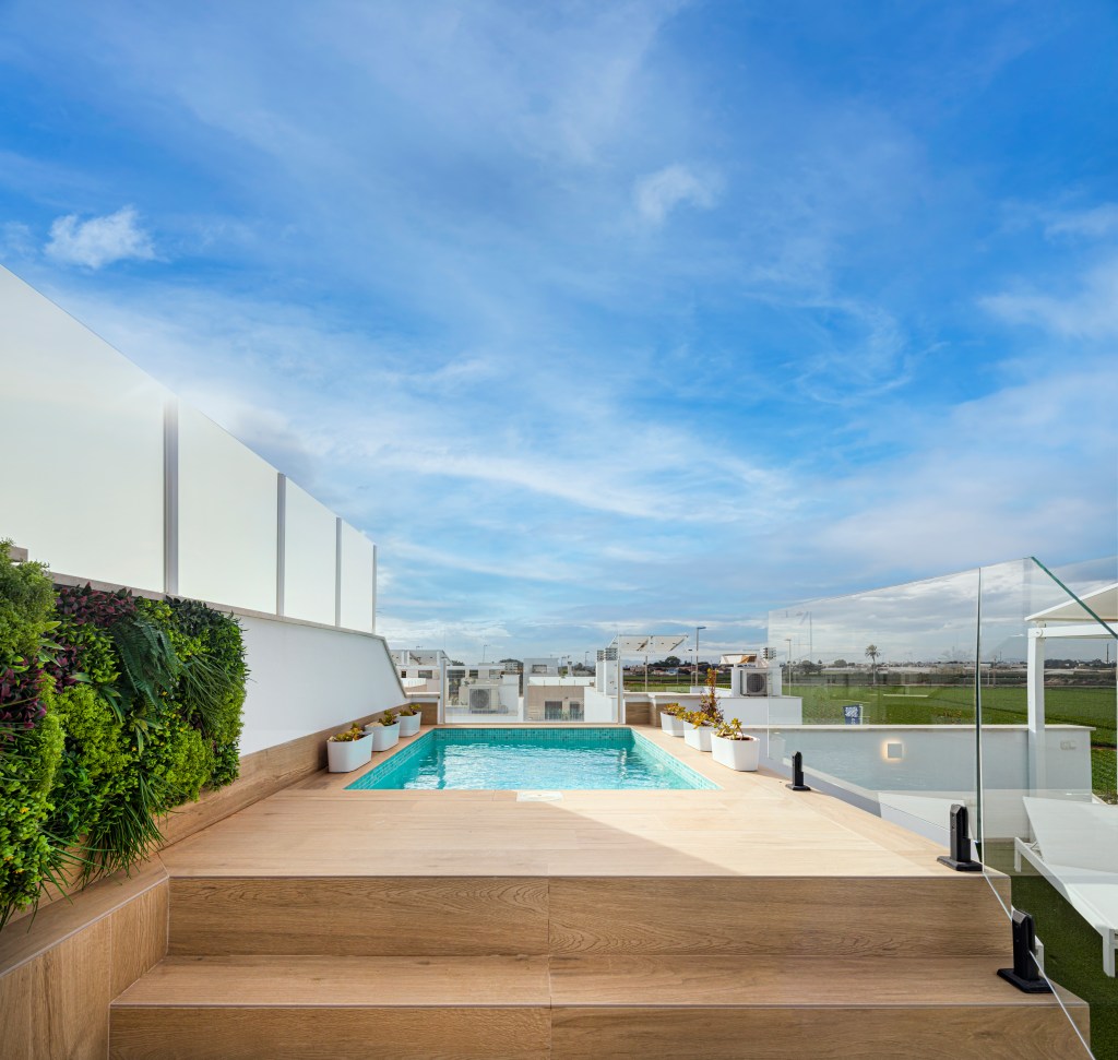 Se vende apartamento/bungalow en planta alta, en esquina, de 3 dormitorios y 2 baños, con piscina privada en el solárium. Incluye todos los muebles, la decoración y extras incorporados.