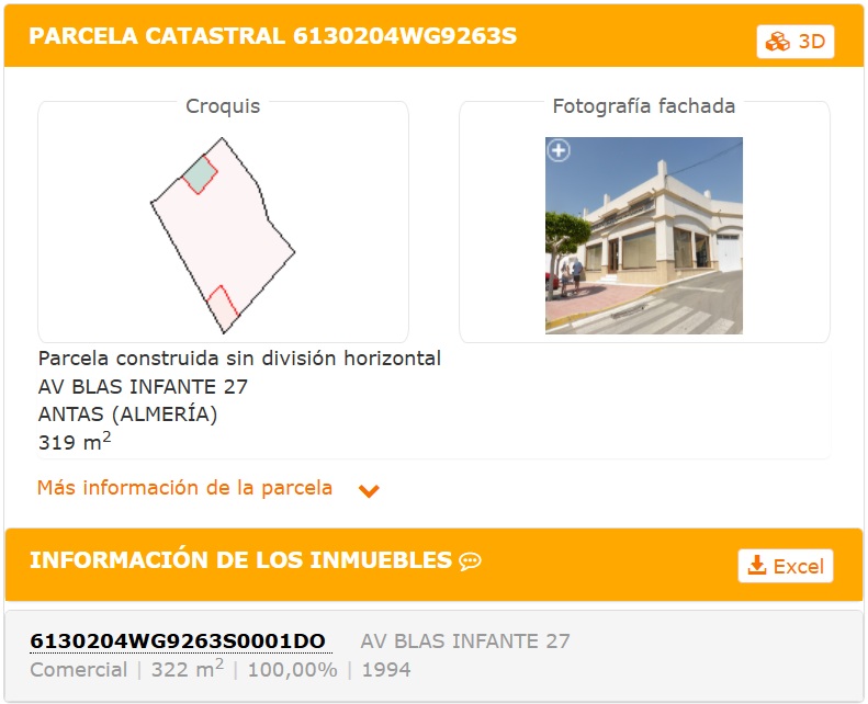 Local en venta, clase urbano de uso comercial, con una superficie de parcela de 319 m2 y construida de 322 m2; situado en la calle Blas Infante de Antas, a la entrada del pueblo desde El Real, con ubicación inmejorable junto a la carretera. Construido en 1994.